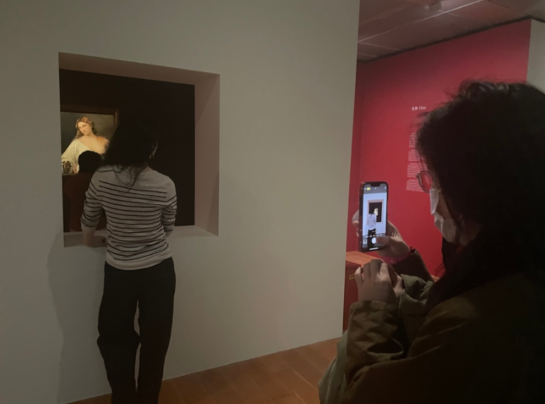 展览现场,《花神》前聚集了不少人打卡拍照。主办方为这幅名作特意设计了一扇“窗户”。透过“窗户”看这位举世闻名的“美人”,更添一份意境之美。