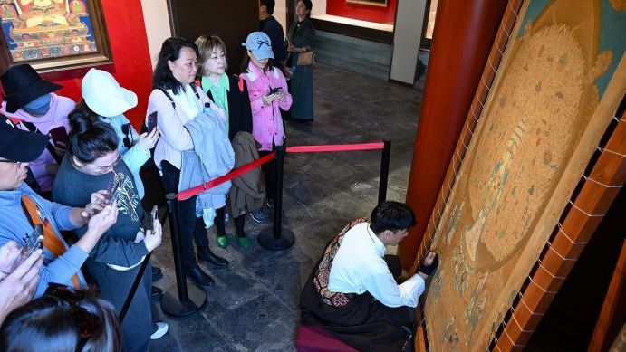 唐卡传承人央迫在展览现场展示唐卡绘制技艺。(图/中新网)