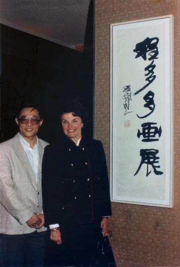 1987年程多多(左)在美国旧金山举办画展,时任市长黛安·范因斯坦(右)前来祝贺。(图/中新社)