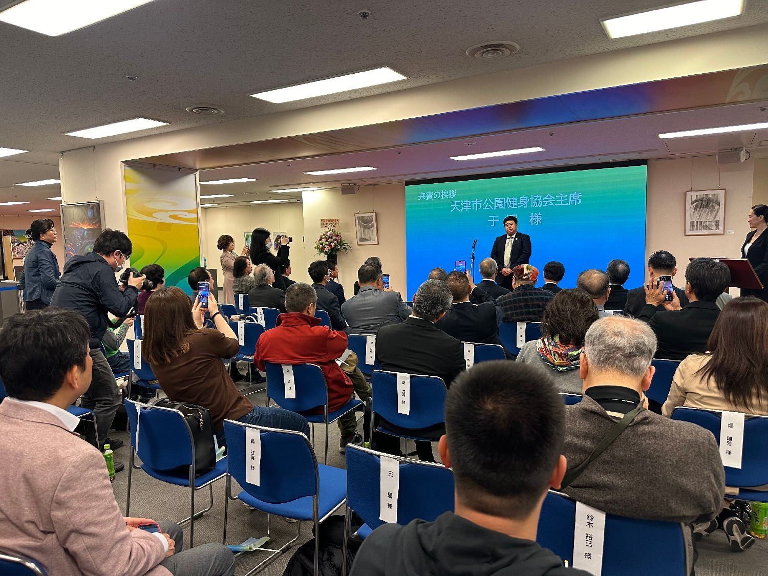 天津市公园健身协会主席于桐、协会顾问兰公胜、副秘书长唐棣、外联部部长韩云学、国际交流部部长张景秀、常务理事张宏以及日中协会理事长、原日本驻重庆总领事瀬野清水、日中友好协会常务理事、东京都日中友好协会副会长永田哲二、原参议院议员、国际政治经济学者浜田和幸、自由民主党议会议员渡部俊明、东京都日中友好协会常务理事、文化交流委员会委员长斋藤成、日本华人文联主席、西泠印社理事晋鸥、在日天津同乡会会长李振溪、中文导报社社长杨文凯、日中商报社编辑长孙逊、东京国际艺术展览会理事长常常、中日交流伦壇名誉会长张可喜、中国武术巨星演员、世界健康协会副主席郭良、世界华裔连盟孔子协会主席孔健、一般社団法人生命の碧い星代表理事松崎修明、莱蒙国际日本事務所代表屠龙字鸿、全日本华人印社副秘书长丹羽弘一、日中民间友好交流振兴协会会长周防恋子、翰墨书道会副会长盈衣、全日本华人书法家协会副秘书长高娃等日中友好团体各界知名人士及外国驻日部分主流媒体共同参加了此次交流会。