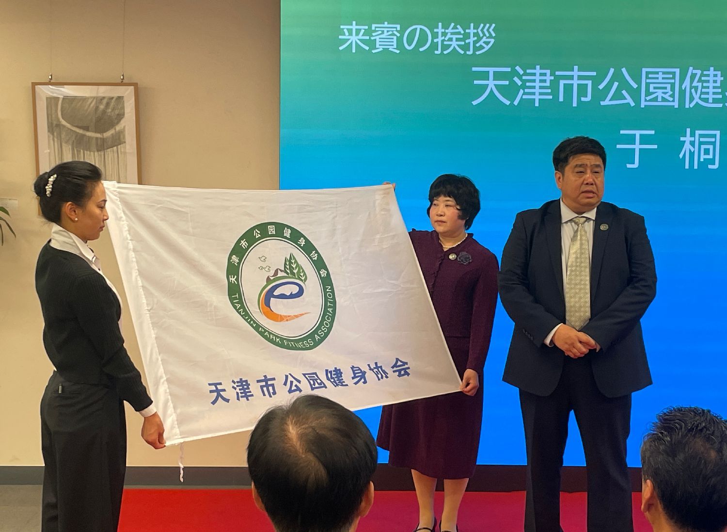 天津市公园健身协会向日中协会、日本华人文联、在日天津同乡会赠友好联盟旗。