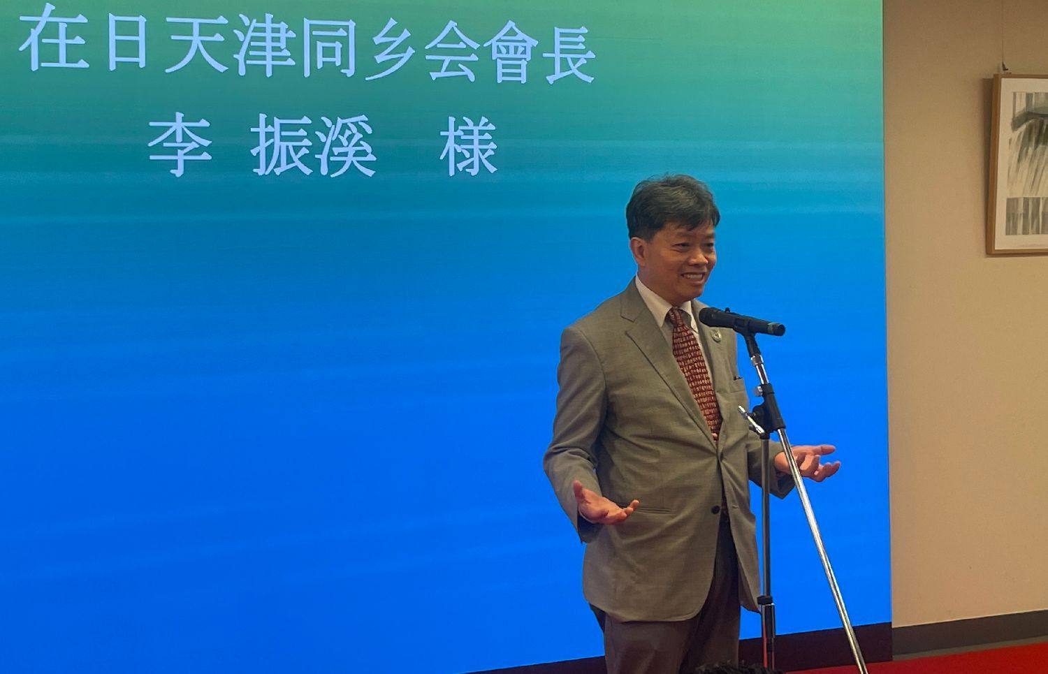 在日天津同乡会会长李振溪说,天津是中国北方超大型城市,常驻人口1400万,是中国北方重要的经济、交通中心城市,是中国四大直辖市之一。天津与日本多方面交流密切,经济往来活跃,更需民间开展友好交流。