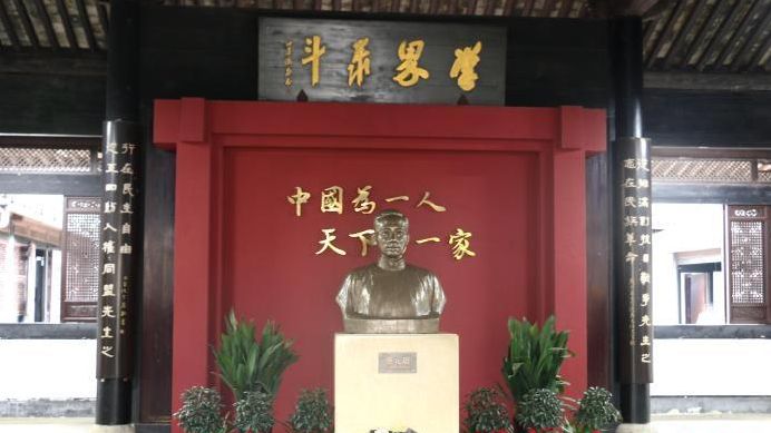 第二进的蔡元培半身铜像前,摆放着一束鲜花,或为参观者所送。映衬铜像的大红立屏上,印刻着蔡元培生前的愿望:“中国为一人,天下为一家”。