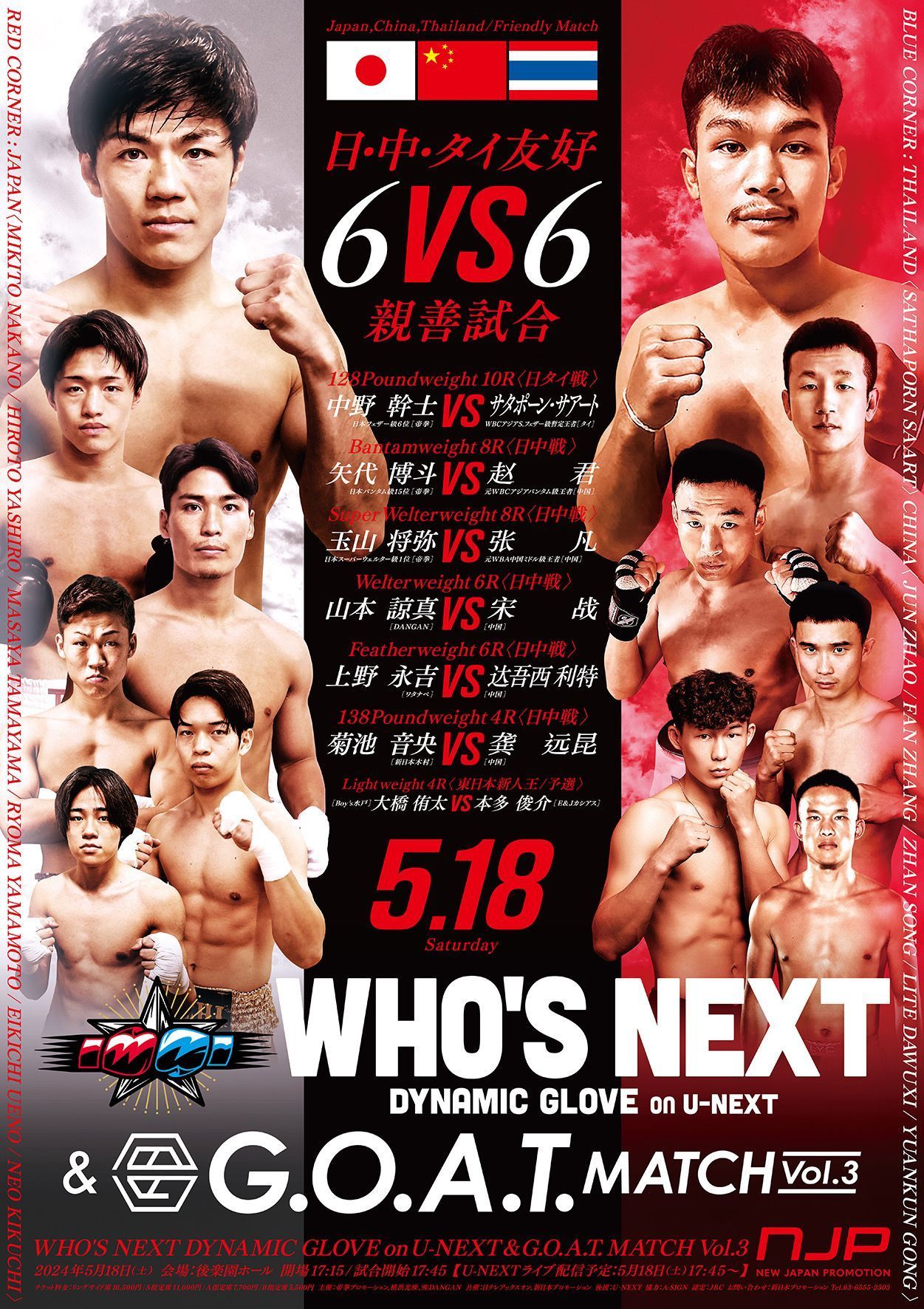 记者从发布会上了解到,中日泰和平友好6V6职业拳击排名赛将于5月18日(星期六)晚在东京后乐园的拳击圣地隆重举行,本次比赛是由新日本推广(NJP)主办的“WHO’S NEXT DYNAMIC GLOVE on U-NEXT”G.O.A.TMATCH第3弹。