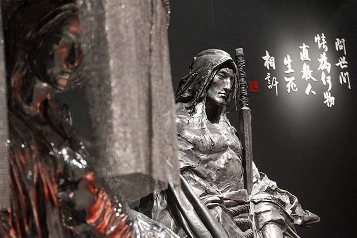 3月15日,香港文化博物馆举行“侠之大者——金庸百年诞辰纪念·任哲雕塑展”传媒预览活动,图为以金庸武侠小说人物为原型创作的雕塑作品“杨过”(后)及“小龙女”(前)。(图/中新社)