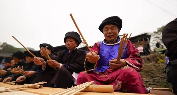 1尺2寸长的竹片,一支在面前横放,其余拿在手中,每诵完一段,就拿起一块搭在面前的竹片上,放完12块,就诵完了一组。这是中国国家级非遗传承人丹寨县扬武镇扬颂村贾师李会堂颂“理”的场景。