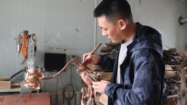 马春雨在制作浪木根雕。(图/中新网)
