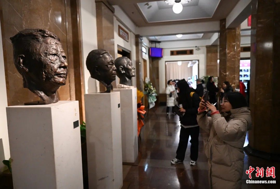 观众在首都剧场拍摄老舍先生塑像。(图/中新网)