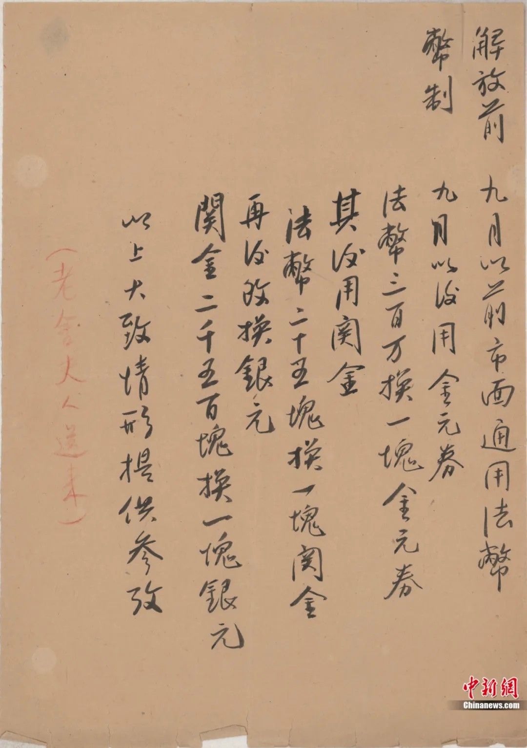 解放前钱币兑换手稿。(图/中新网)