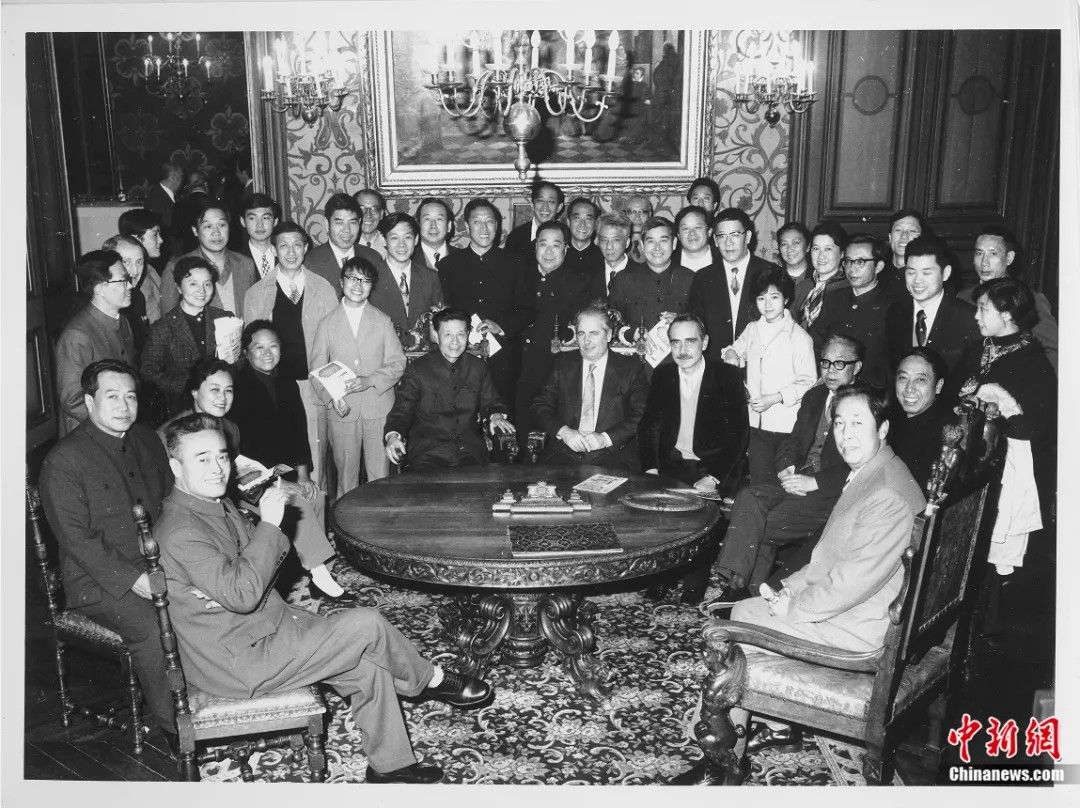 《茶馆》演出团全体演职员在法国奥尔良市政厅和法国政府官员合影。(图/中新网)