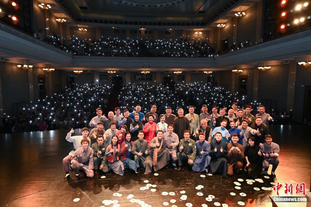 北京人艺话剧《茶馆》的演员在首都剧场与观众合影。(图/中新网)