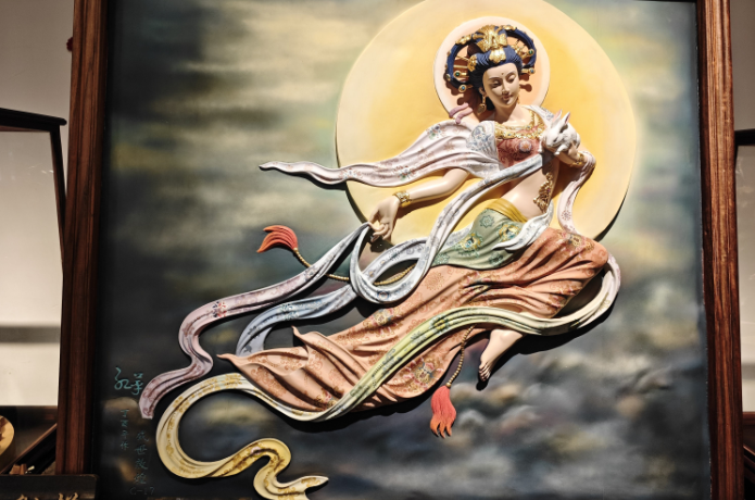 张红萍将中国南派木雕工艺与敦煌莫高窟的矿物粉彩绘结合,再加以特殊的调制和上色,创作出了《出浴》《敦煌吉祥天》《九色鹿的故事》等作品。