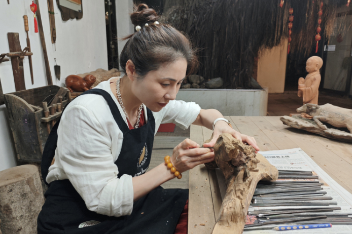 5月15日,张红萍在工作室创作木雕作品。(图/中新社)