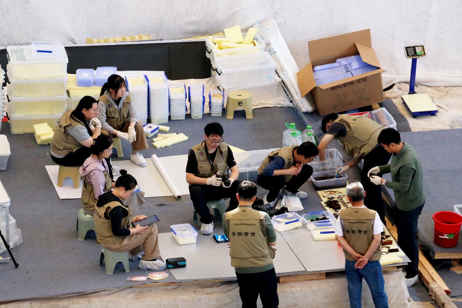 在考古发掘现场,十多名工作人员正在进行文物提取和整理工作。截至目前,武王墩墓已提取各类文物共3000多件(组),以及大量动植物遗存等。