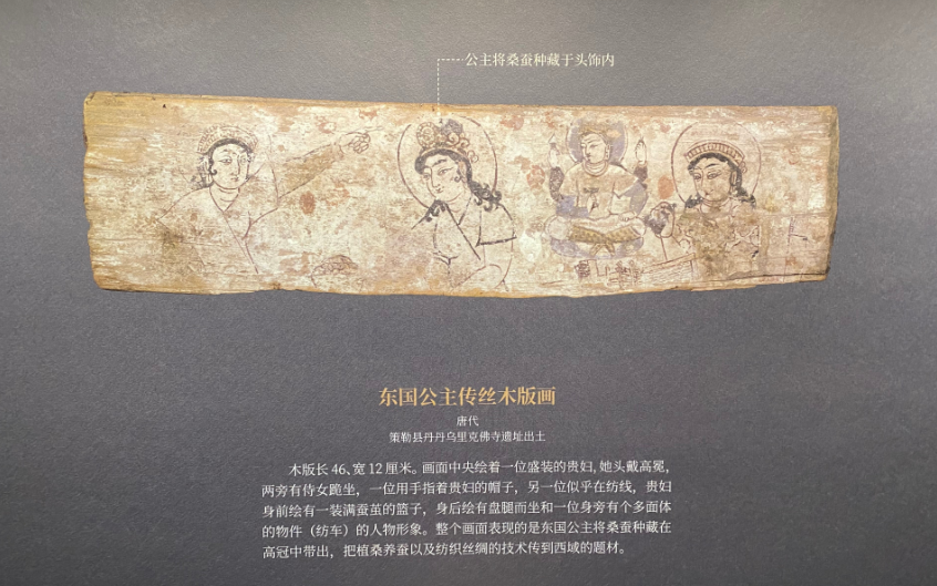 这一故事是否真实存在?1900年,英国人斯坦因对和田地区策勒县的丹丹乌里克遗址进行盗挖时,发掘并带走了一批精美的木版画。其中有一件唐代“传丝公主木版画”,经学者分析研究,认定其描绘的应该就是玄奘在《大唐西域记》中记载的“蚕种西传”故事。
