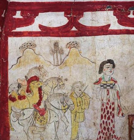 墓室西壁南部为驼马图,远处绘有山和树,近处一妇女身着长裙,面向北,双手捧一方盒于胸前,身后一胡人身着黄袍,右手执缰绳,左手持马策。墓室东、西壁的北半部及北壁是围绕棺床的一组屏风画,共计八幅,以“树下人物图”为主。