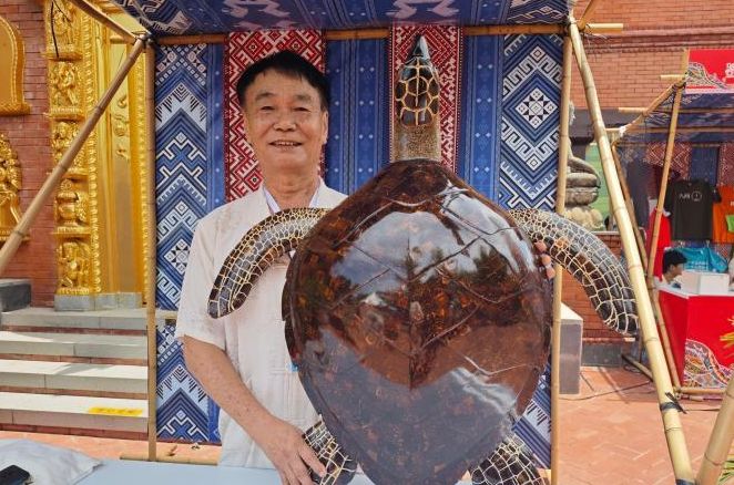 非遗市集上,一只栩栩如生的海南椰雕作品《玳瑁》引人注目。来自文昌的中国国家级非遗项目“海南椰雕”市级代表性传承人黄良敏介绍,《玳瑁》长约85厘米、重约5.5公斤,由四千多块椰壳碎片拼接而成。黄良敏说,自己现今开设了一家椰雕工作室,结合文昌当地的航天旅游主题,自主设计椰雕作品,颇受消费者喜爱,也让更多人了解到海南椰雕技艺。