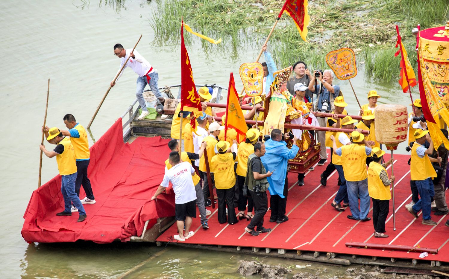船队靠岸时,信众们将坐着妈祖金身的轿子抬高又放下,不断上下沾水36下,以此祈求平安吉祥、渔业丰收。紧接着,龙舟赛拉开序幕。来自台湾新北市的台胞高宏翊说,“妈祖信仰在台湾很浓厚,两岸一家,希望越走越亲。”