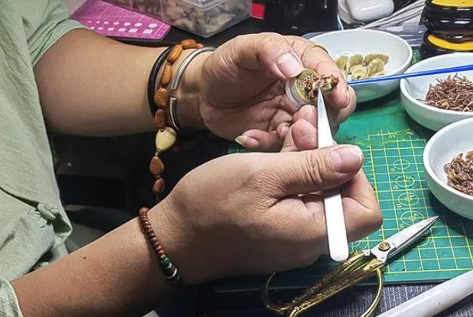 近日,坐在工作台前,韩僖僖左手拿着一个辛夷(玉兰花蕾的中药名为辛夷),右手用镊子把一个小小的蝉蜕粘上……很快,一个穿着虎皮裙、头戴金箍的齐天大圣便做好了!
