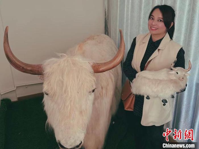 6月23日,“说如意甘肃——海峡两岸媒体人走进白牦牛故乡”主题活动在甘肃进行中。图为阿雅与白牦牛雕塑合影。受访者供图