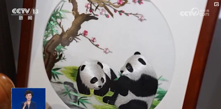 藏羌织绣绣出的大熊猫。(图/中国央视新闻视频截图)
