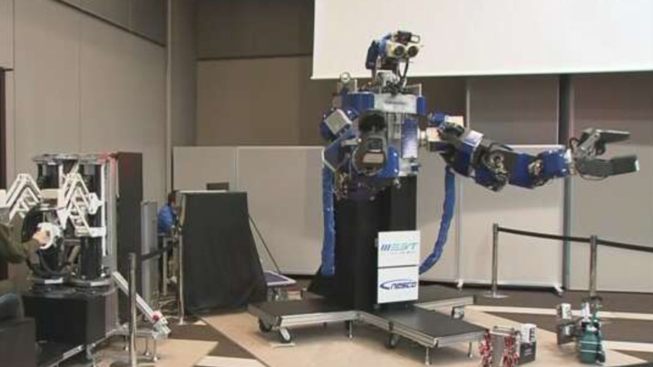 操作者通过头戴的护目镜观看机器人的视角,改变脸部方向时机器人也会做出相同的动作,操作杠杆能感受到举起物体的重量。