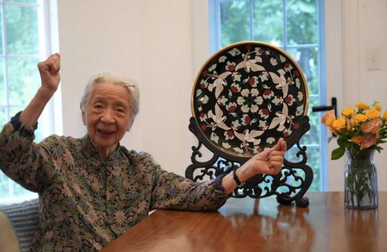 图为常沙娜与景泰蓝《和平鸽大圆盘》。(图/《北京日报》客户端)