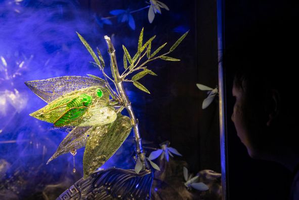 《悟蝉知翠》是陈世英代表作之一。1973年陈世英成为宝石雕刻学徒时,遇到的第一个难题便是雕刻玉蝉。“蝉”与“禅”同音,在中国传统文化中寓意丰富。这件2012年的作品是陈世英对于这一题材近40年的思考,被单独陈列在一个空间里。走进这个空间,头上倒悬着一只巨大的蝉,望进展台之中,以翡翠为主要材料的蝉趴在竹叶之上,竹叶的叶脉是常常出现在古代青铜器上的纹路。背景里,金属网纱制成的恍若废墟的背景上,停留着一只只素色蝉,让人联想蝉所蕴含的“重生”之意。