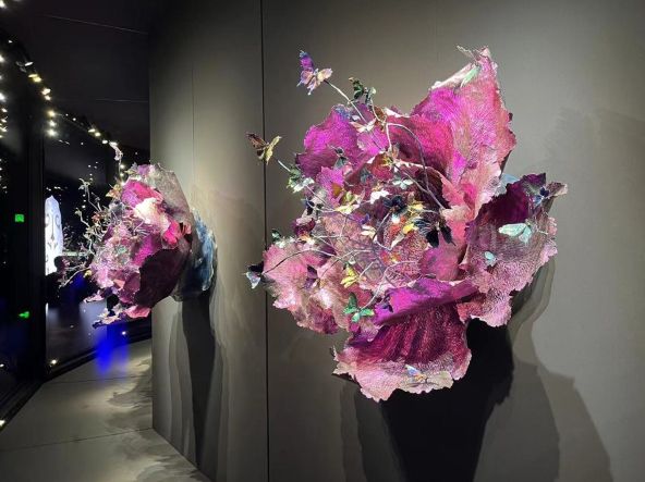 展厅里几件钛金属花朵装置引人关注。除了缱绻多姿的花瓣、细密繁复的金属雕刻纹路以及幻化成蝶的花蕊,通过多重镜面反射,观众站在装置前,能看到花朵的不同面。这样的装置对应了以陈世英命名的珠宝切割技术“世英切割”。正是这一于1987年独创的宝石切割技术,奠定了他雕刻大师的地位。