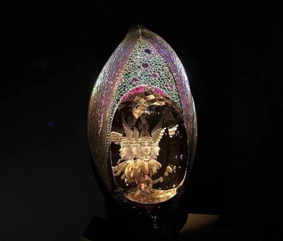 在花朵对面的展台里,展出多件运用这一技术切割宝石的作品。一件名为《春日女神》的胸针,郁金香造型中间镶嵌有巨大的水晶,水晶中间是女神形象,除了正脸,还能同时看到女神不同角度的侧面。