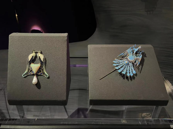为了让观众看到这种区别与联系,展方还同时展陈了多件不同时期、不同地区的文物。陈世英的作品以蝴蝶著称,展览现场除了他一整墙风格不同、姿态各异的蝴蝶作品外,还陈列了上博馆藏的明代玉蝴蝶和来自英国国立维多利亚与阿尔伯特博物馆、约1900年由法国杰出金匠吕西安·盖拉德(Lucien Gaillard)打造的新艺术风格蝴蝶形挂坠。而另一件陈世英以孔雀为题材的作品《赫拉女神》旁,则展出了来自大都会艺术博物馆、新艺术风格知名设计师勒内·拉利克(RenéLalique)的孔雀作品和中国古代的凤凰造型点翠簪。