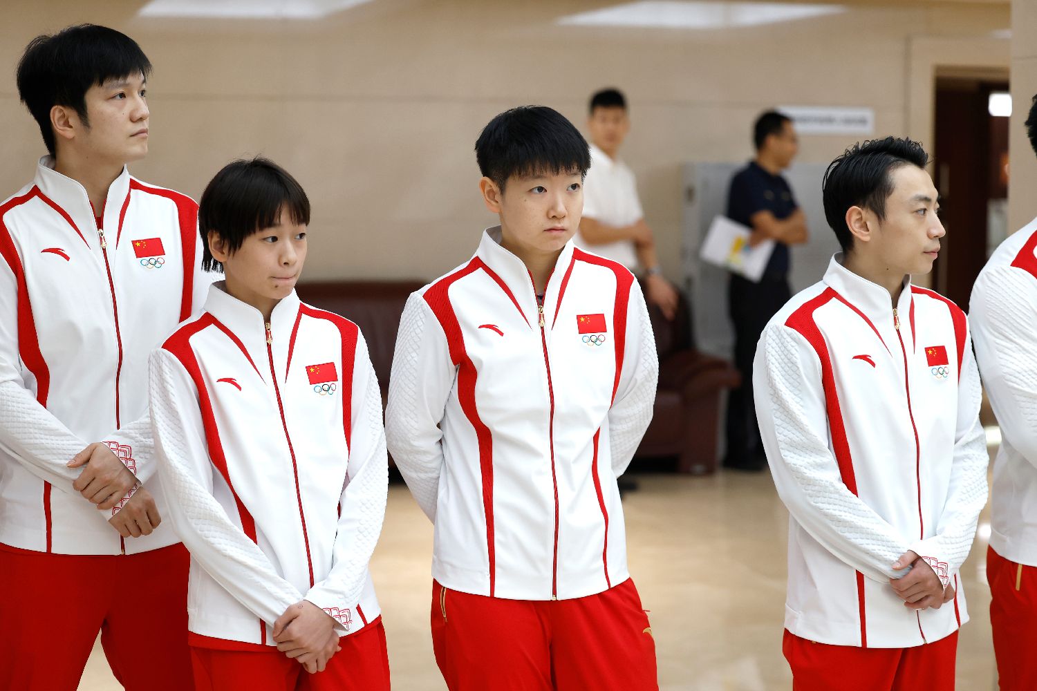 中国体育代表团成员樊振东、全红婵、孙颖莎、邹敬园(由左至右)准备合影。(图/中新社)