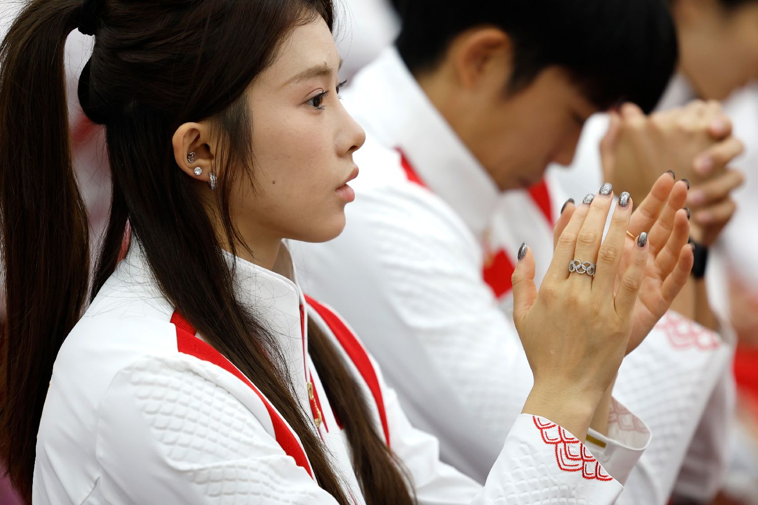 中国体育代表团成员吴艳妮佩戴五环戒指参加代表团成立大会。(图/中新社)