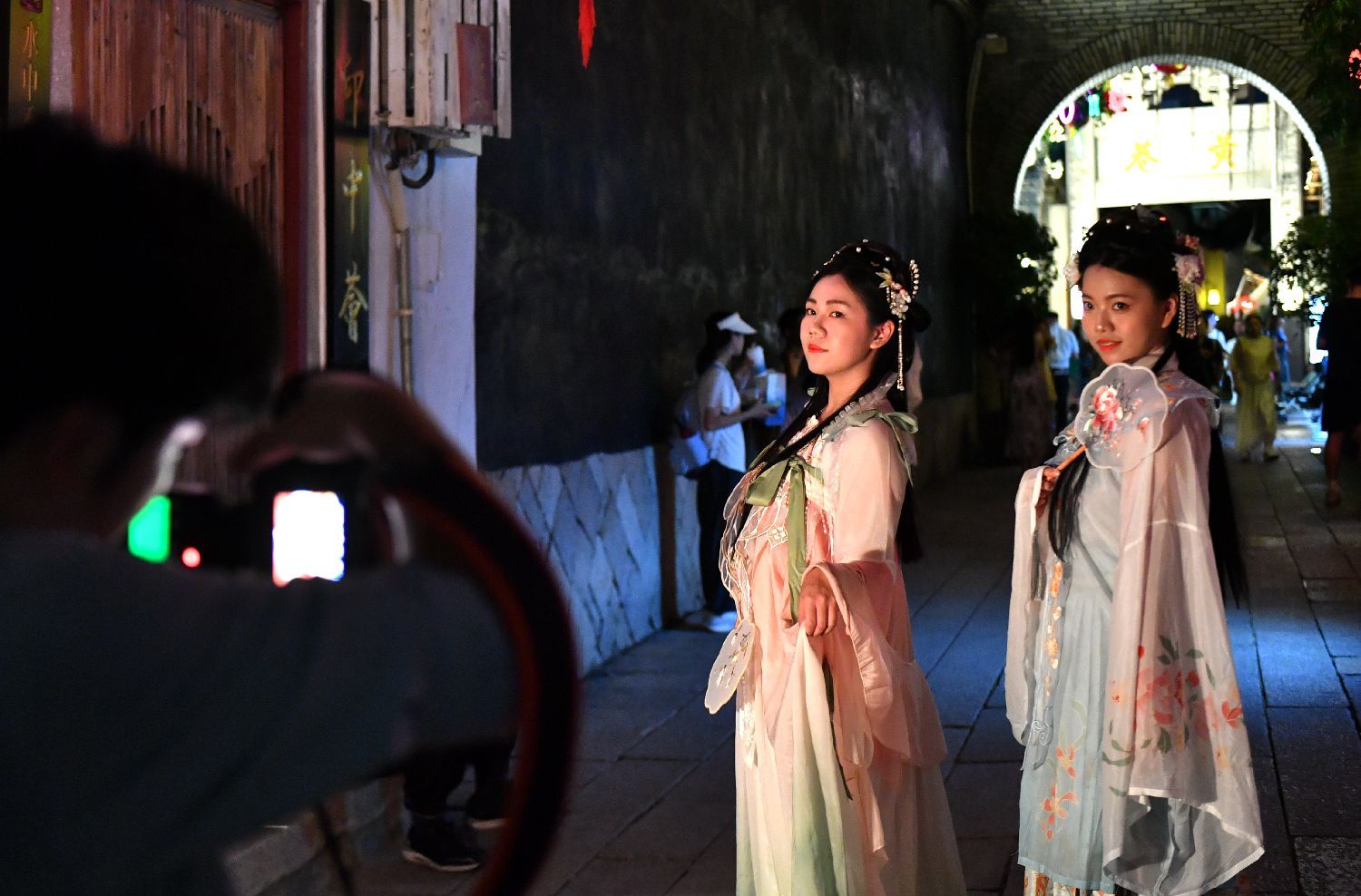 当地时间7月15日晚,来自台湾高雄的韦淳(中)和韦霓姐妹二人身着唐制汉服在福州市三坊七巷的衣锦坊旅拍。(图/中新社)