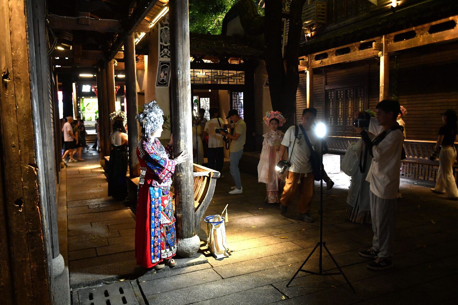 时值暑期旅游旺季到来,不少旅拍店增加服饰和道具,满足各个年龄段顾客的需求。而酷暑高温天里,游客多选择在夜间拍摄。令狐钟浪说,夜间拍摄,没有烈日暴晒,在坊巷里走动的人相对少些,路面上的灯又可以当氛围灯,很出片,与白天的美是不同的。