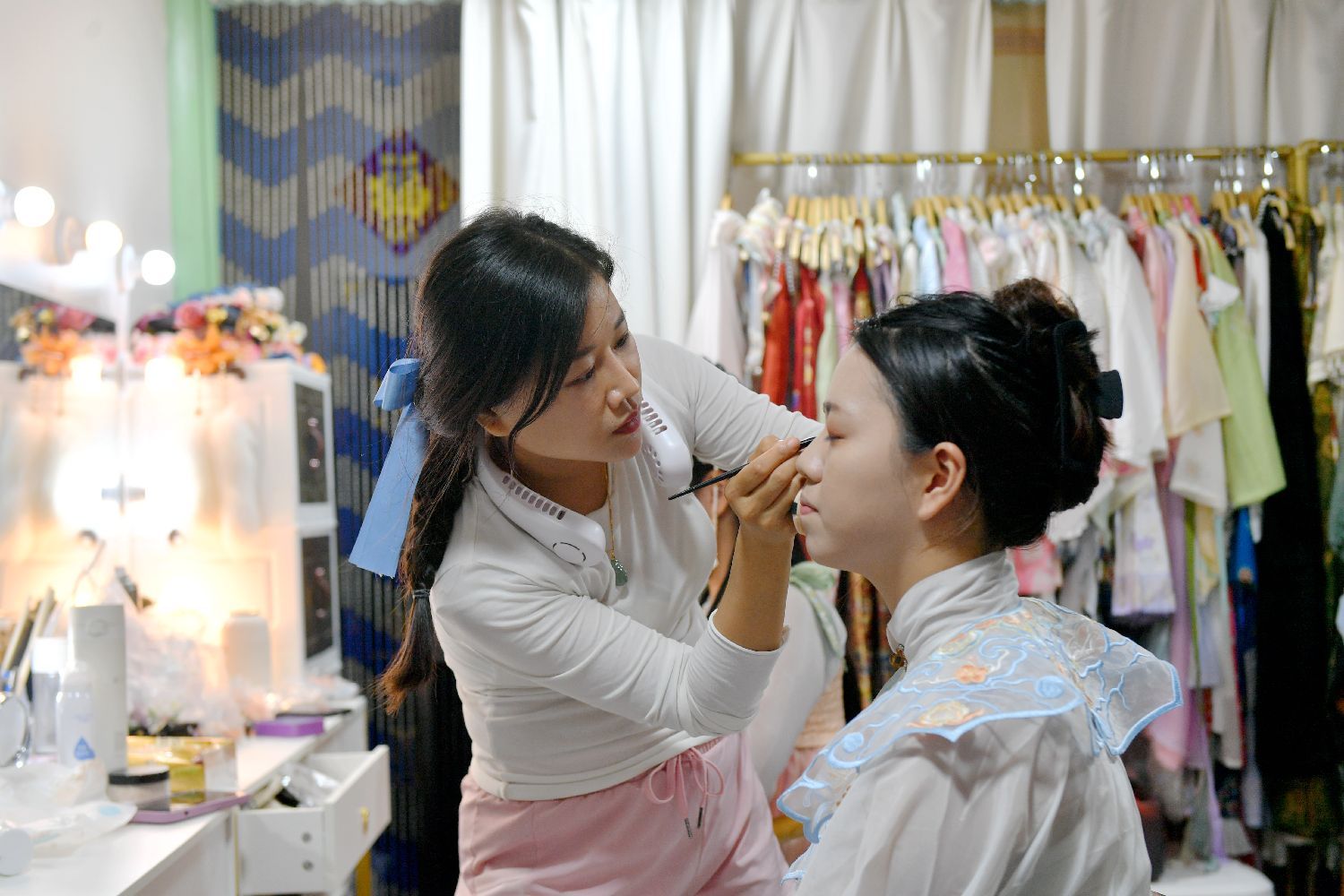 7月15日晚,旅拍化妆师为韦霓上妆。(图/中新社)