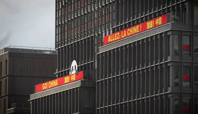 巴黎奥运村中国代表团住宿区大楼外侧的卡通熊猫。(图/济南齐鲁网)