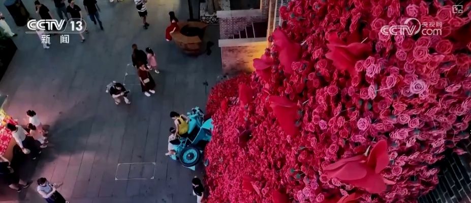 到“网红”打卡地“瀑布花墙”与鲜艳的玫瑰合照。中心广场上,乐队演奏、魔术表演、民国风情演出和小洋楼建筑相得益彰,给游客们带来了一场视觉与听觉的盛宴。