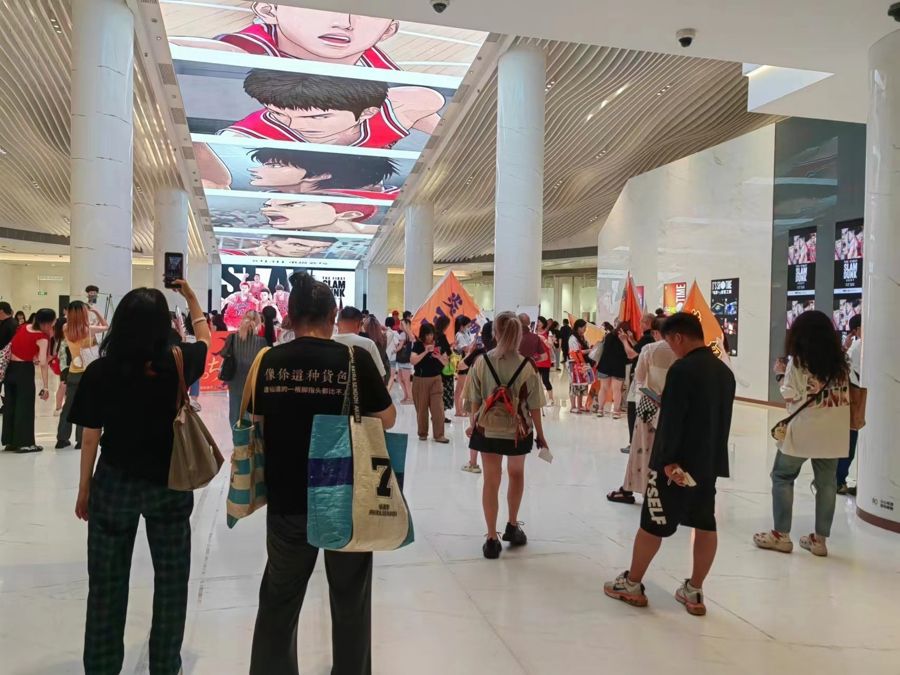 8月3日,上海影城SHO又成为《灌篮高手》的海洋。影院标志性天幕显示着《灌篮高手》巨幅海报,不时有手持周边、穿着各色球衣的观众在天幕前打卡合影,挥舞复刻电影中“炎之男”等各色“战旗”的粉丝引来同好围观。一楼曾用来做小型展览的场地变为临时小型“集市”,各种摊位上摆着粉丝自制的胸章、卡片、海报等。这些非营利的二创制品吸引同好交流,记者刚踏入其间,就被一位热情粉丝塞了一张免费的自制宫城良田二创明信片。