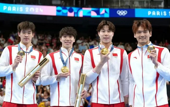 中国游泳队奥运冠军手握装有巴黎奥运会官方海报的长条状纸盒。(图/北京央广网微信公众号)