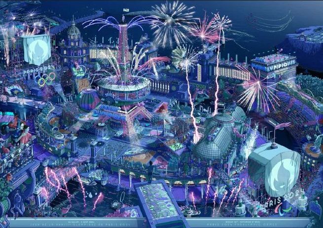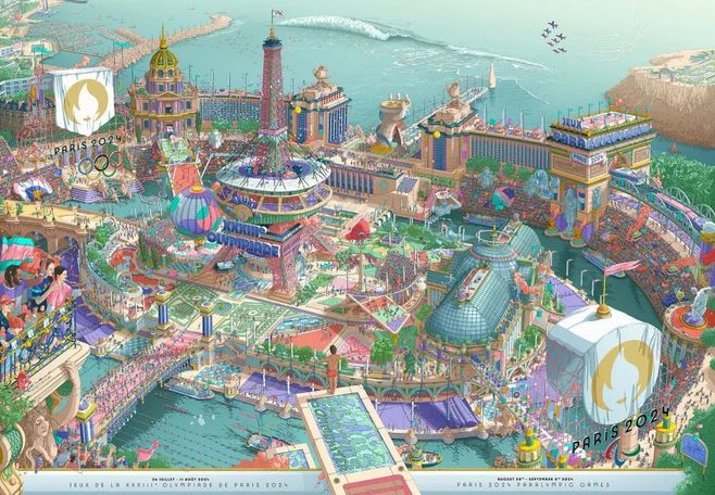 该海报由法国著名插画艺术家乌戈·加托尼创作。巴黎奥运会和残奥会官方海报既可以被看做单独的两幅作品,又可合二为一,成为一张巨幅的完整海报:左边代表奥运会,右边代表残奥会。