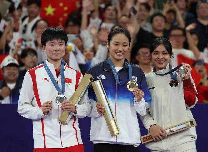 何冰娇(左)在巴黎奥运会羽毛球女单决赛摘得银牌,并手持西班牙奥委会徽章领奖。(图/新华社)