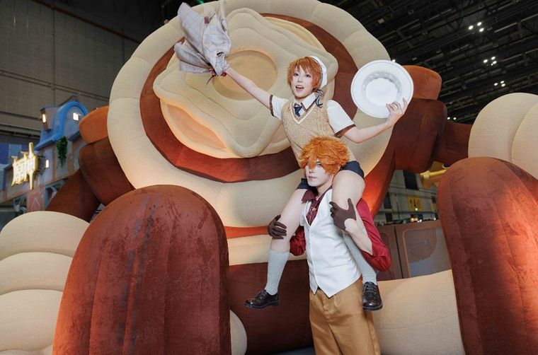 正在大学读一年级的“秋天”和“95后”观众“紫阳”从山东赶到嘉年华现场,两人结识于小红书。“秋天”装扮成《原神》中魈的样子,她是被去年海灯节活动剧情吸引开始玩《原神》。海灯节蕴含丰富中国传统文化元素,被海内外玩家视为游戏世界的新春佳节。扮成钟离的“紫阳”则从2021年开始玩。“扮成钟离,更多是因为我喜欢璃月这个地方。我之前看过的动漫游戏里的异世界设定都以德国、法国、英国为原型,《原神》中的璃月让人耳目一新,也让人惊艳,原来在异世界当中,中国可以这么体现。”“紫阳”说。