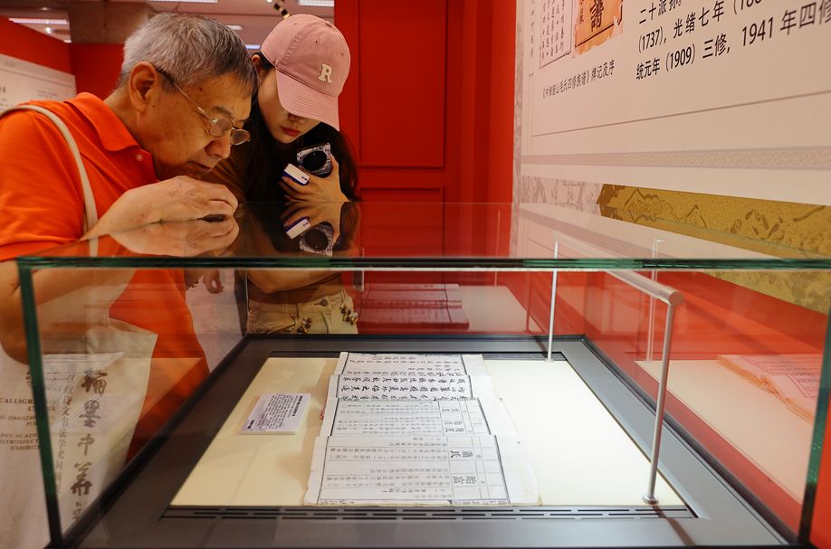 武汉市民15日在湖北省图书馆观看家谱展。(图/中新社)
