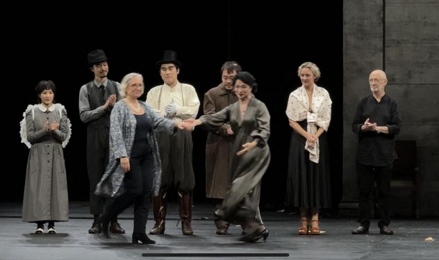 《樱桃园》首演,金星(右三)携图米纳斯家人和众主创、演员一起登台谢幕。(图/《北京日报》客户端)