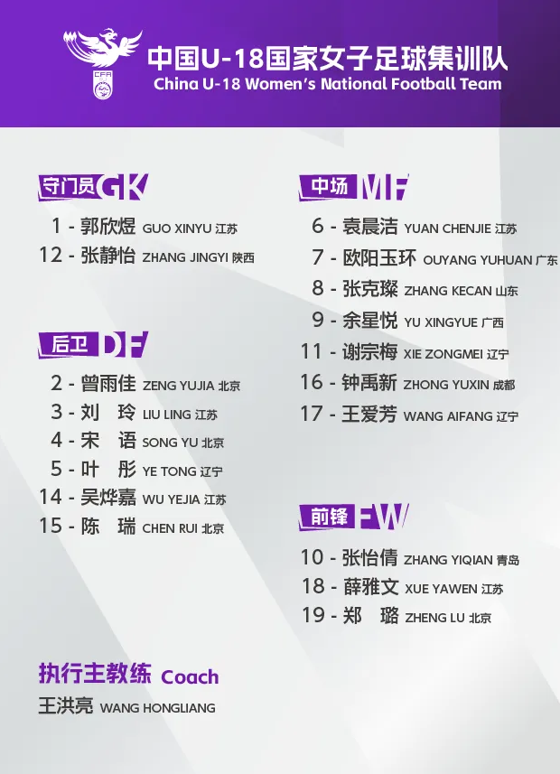 中国U-18国女足集训队成员名单(图/中国足协官方网站)