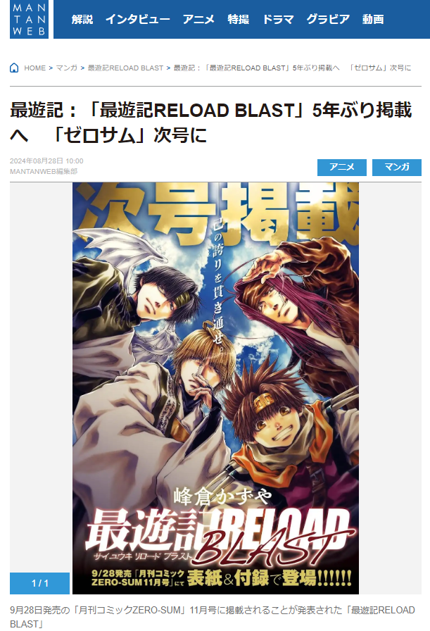 人气漫画《最游记》最新系列——《最游记RELOAD BLAST》将时隔5年再次在杂志《月刊comic ZERO-SUM》刊载。(图/“MANTANWEB”网站报道截图)