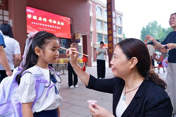 图为9月1日,河北省石家庄,老师为一年级新生“朱砂启智”。(中新社)