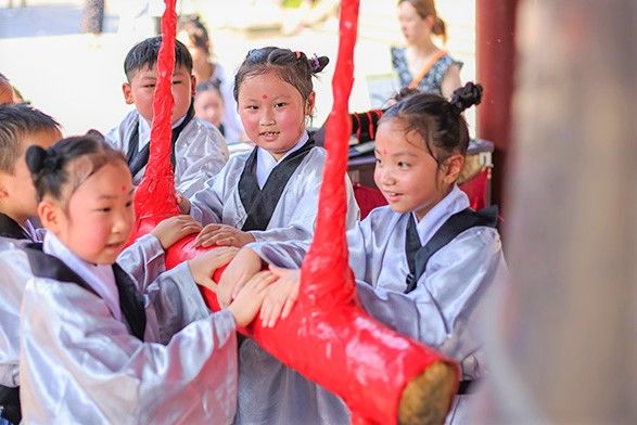 图为9月1日,江苏南京,身着古装的孩子在夫子庙参加撞钟仪式。(中新社)