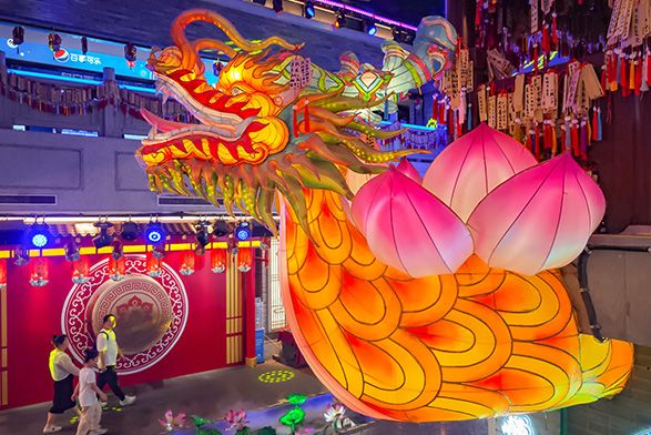图为9月1日,江苏南京,游客在城南秦淮·戏院里参观古风市集、上元灯会,体验“人在戏中游”沉浸氛围。(中新社)